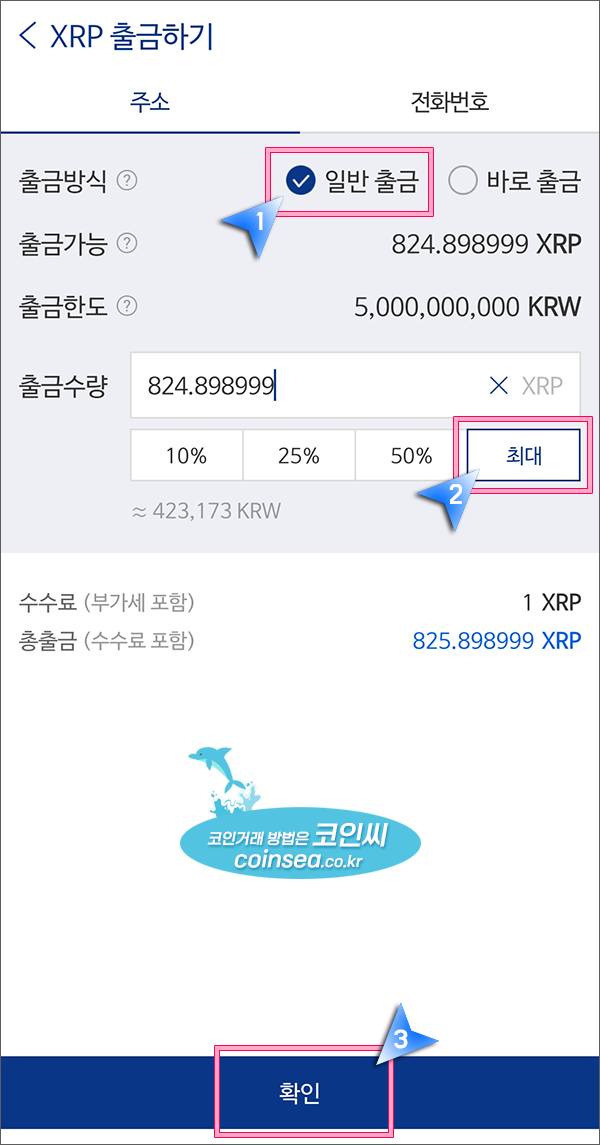 11. '일반 출금'을 선택하고 출금 수량은 직접 입력하거나 전부 보내시려면 "최대" 버튼을 클릭하고 "확인"을 클릭합니다.