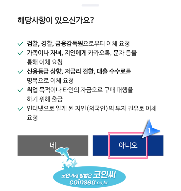 19. 불법적인 목적으로 출금을 하는지 묻는 메시지입니다. "아니오'를 클릭합니다.
