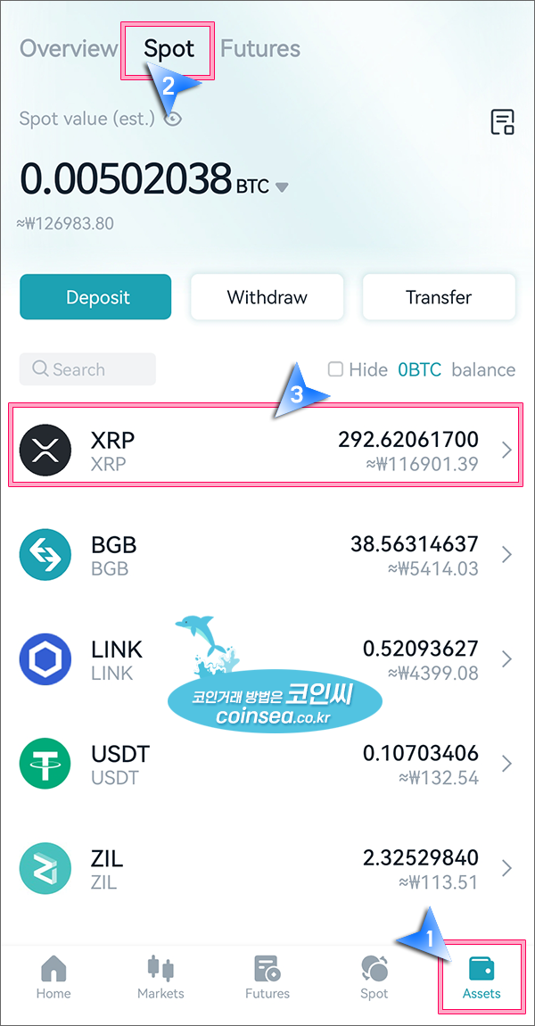 1. 비트겟 앱 하단의 Assets을 클릭한 후, 자산에서 현물지갑인 'Spot'을 클릭합니다. 그리고 국내거래소에서 입금된 리플을 선택합니다.