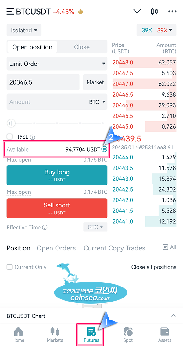 8. 선물거래를 하기 위해 앱 하단의 "Futures"를 클릭하시면 사용가능한 자산에 방금 이체된 USDT가 표시되어 있는 것을 확인할 수 있습니다. 이제 선물거래 화면으로 이동해서 선물거래를 하시면 되겠습니다.