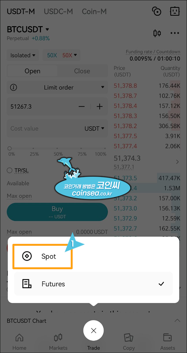 2. 선물거래 화면에서 다시 한번 Trade 버튼을 살짝 터치를 하면 Spot와 Futures가 있는데 현물거래인 Spot를 클릭합니다.