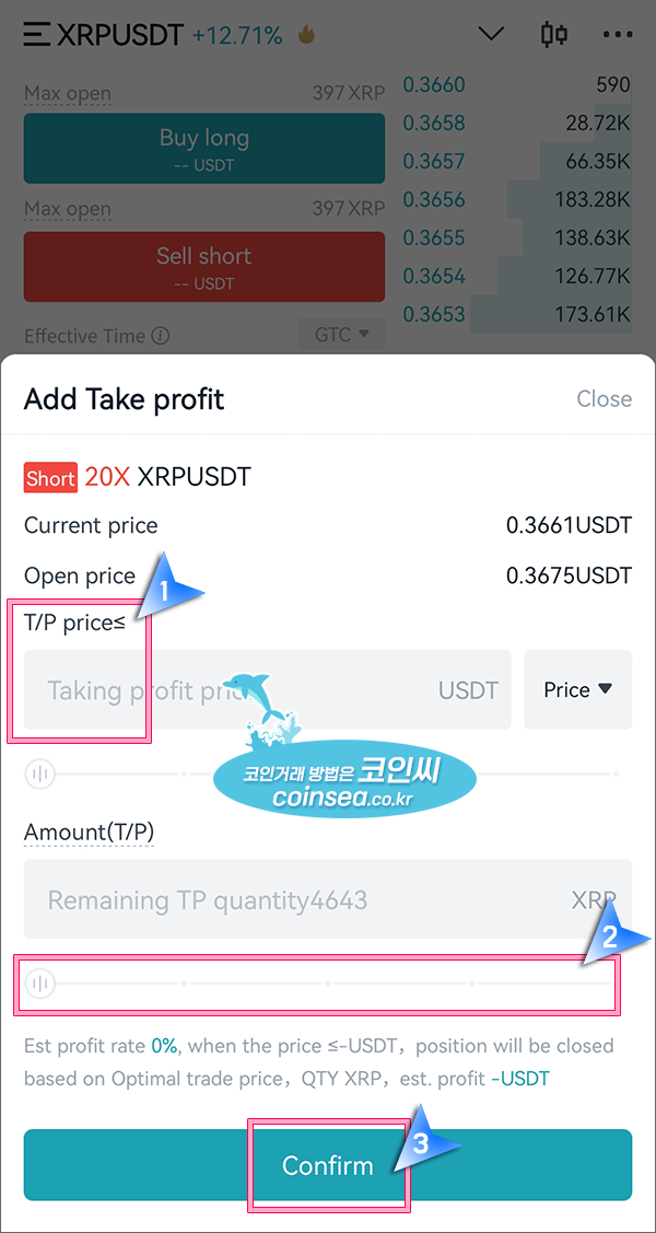 2. T/P price에 익절가를 입력하고 수량(Amount)은 막대바를 이용해서 100%로 조정합니다. 해당 가격에 절반만 익절하고 나머지는 더 지켜보겠다면 50%만 설정하시면 됩니다. 그리고 Confirm을 클릭합니다.