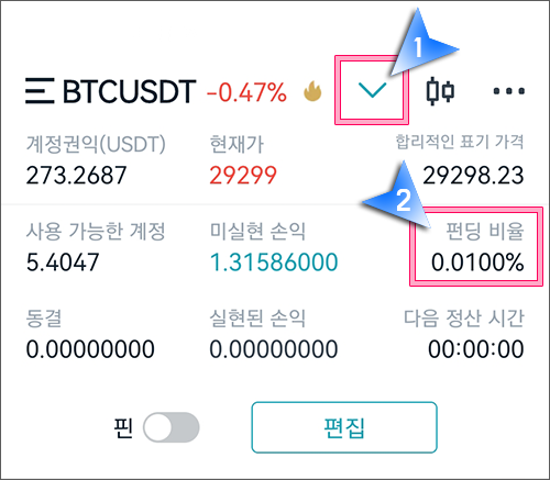 모바일에서 펀딩비를 확인할 수 있는 곳은 맨 윗쪽에 V 자 표시를 클릭하면 "Fund Rate(펀딩비율)"라고 나와 있습니다.