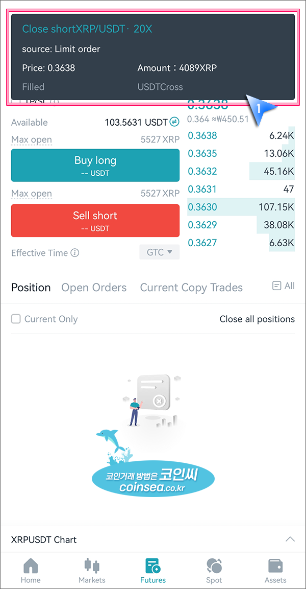 포지션 종료 주문이 완료되면 상단에 해당 내역이 잠깐동안 표시되고 사라집니다. 하단의 포지션 탭을 보면 포지션 내역이 깔끔하게 사라진 것을 확인할 수 있습니다.