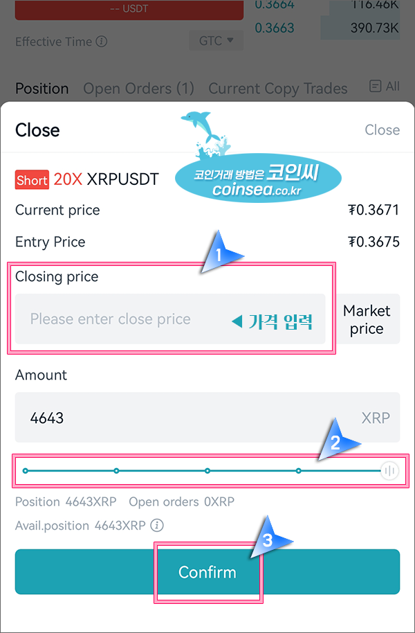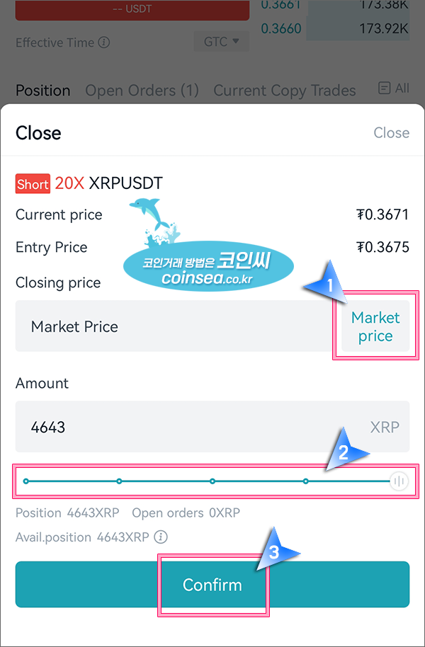 Market price가 검정색이면 지정가이며, 좌측에 Please enter close price에 포지션을 종료할 가격을 입력하시고 막대바를 우측으로 당겨서 100%로 설정후 Confirm을 클릭하시면 됩니다. 포지션을 절반만 정리하시려는 분들은 막대바를 중간까지 위치하게 옮겨서 50%로 설정하신 후 Confirm을 클릭하시면 됩니다.