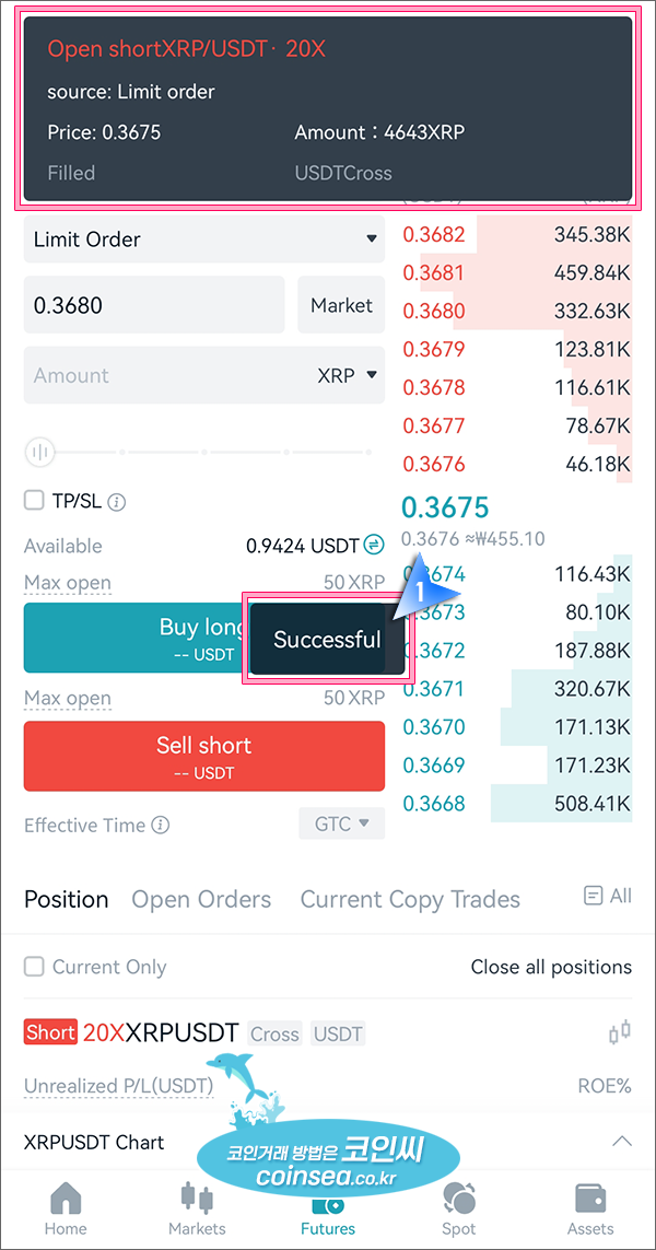 3. 주문이 체결되면 윗쪽에 이렇게 체결내역이 잠깐동안 표시되었다 사라지고 하단의 포시션 탭에 해당 내역이 표시됩니다. 저는 레버리지 20배로 리플의 하락(Short)에 투자했습니다.