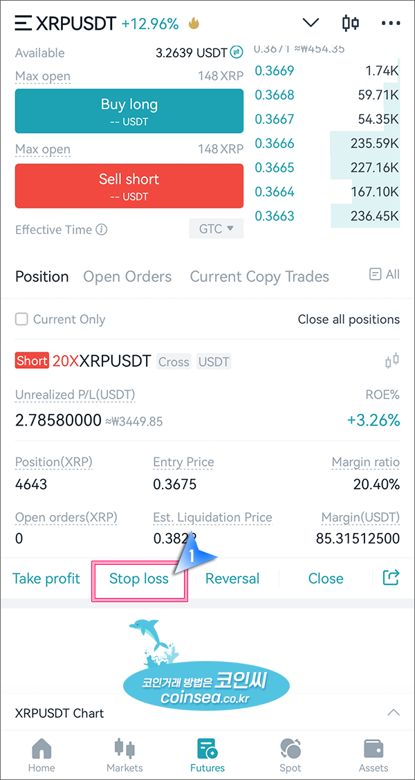 4. Stop loss를 눌러서 손절가로 익절(현재가보다 살짝 아래 손절을 설정해놓고 조금씩 손절라인을 올려가면서 익절)