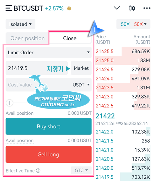 곧바로 포지션을 종료하고 싶으시다면 현재가와 근접한 시세로 지정가 종료를 하거나 아니면 Market를 클릭해서 시장가로 곧바로 종료를 하시면 됩니다. 급락이나 급등시 포지션 종료를 지정가로 설정하고 정리하다보면 시세 변화에 대응하지 못해서 큰 손실이 발생할 수도 있으니 시장가와 지정가를 혼용해서 사용하시기 바랍니다.