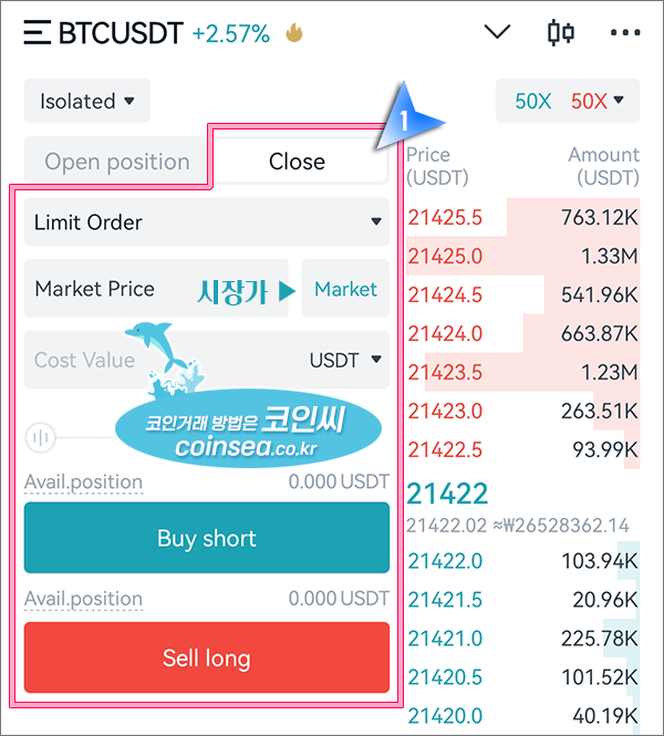 1. 선물거래 화면의 좌측 상단에서 원하는 코인의 선물거래를 선택, 교차모드와 격리모드에서 격리모드를 선택, 그리고 초보자라면 레버리지는 되도록 10배 이내로 지정하시기 바랍니다.