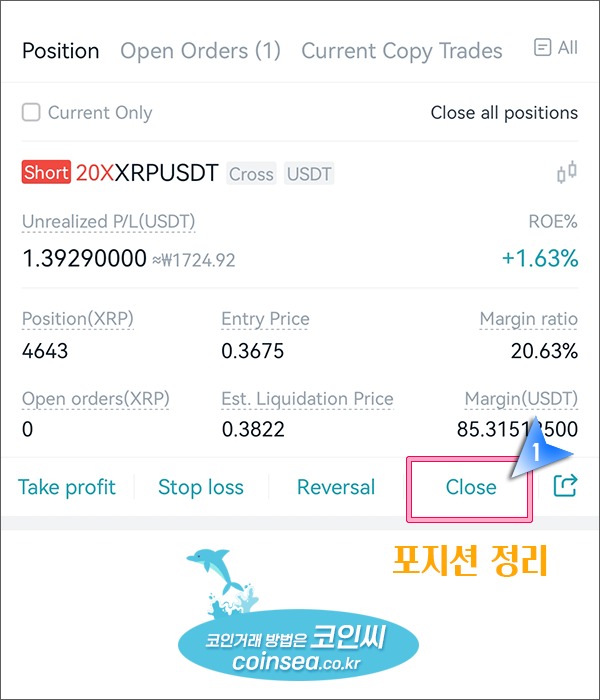 2. 포지션탭의 Close를 눌러서 정리(가장 일반적인 정리 방법)
