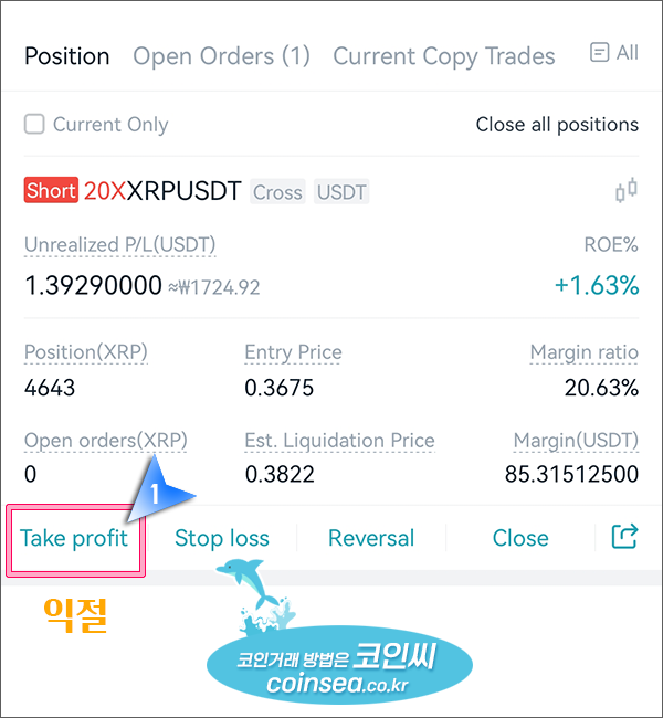 1. 만약 익절가를 설정하고 싶으시다면 포지션 탭 하단의 Take profit을 클릭합니다.