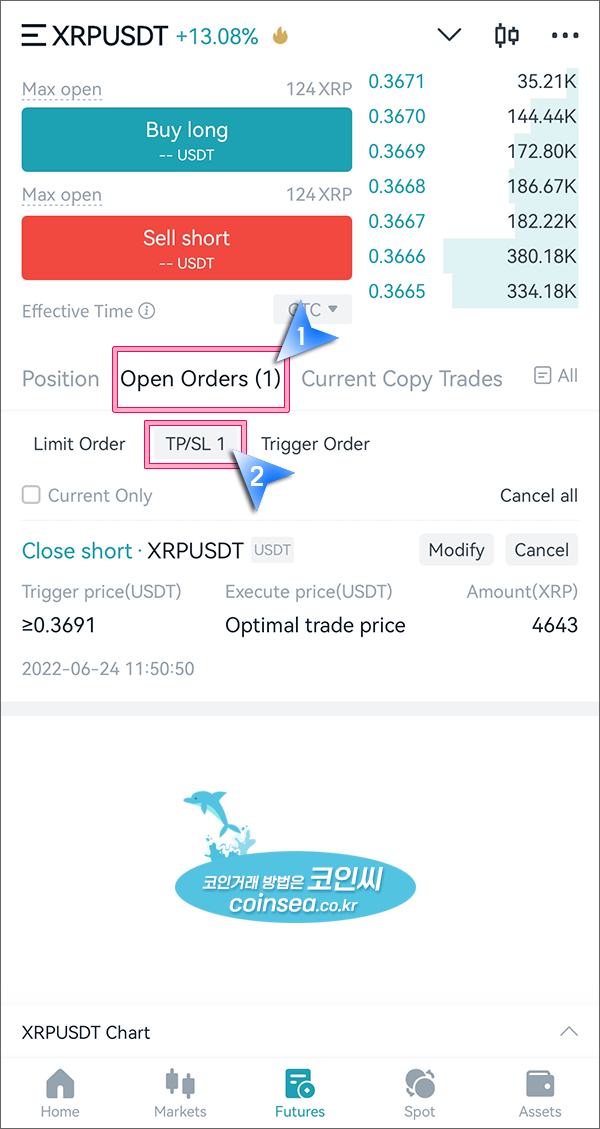 3. 손절가가 설정되면 아직 미체결 주문이기 때문에 Open Orders에 표시되며 (1)이 생성됩니다. 미체결 주문이 2개라면 (2)라고 표시됩니다. Open Order의 TP/SL을 클릭하시면 방금 입력한 손절 주문을 확인할 수 있습니다.