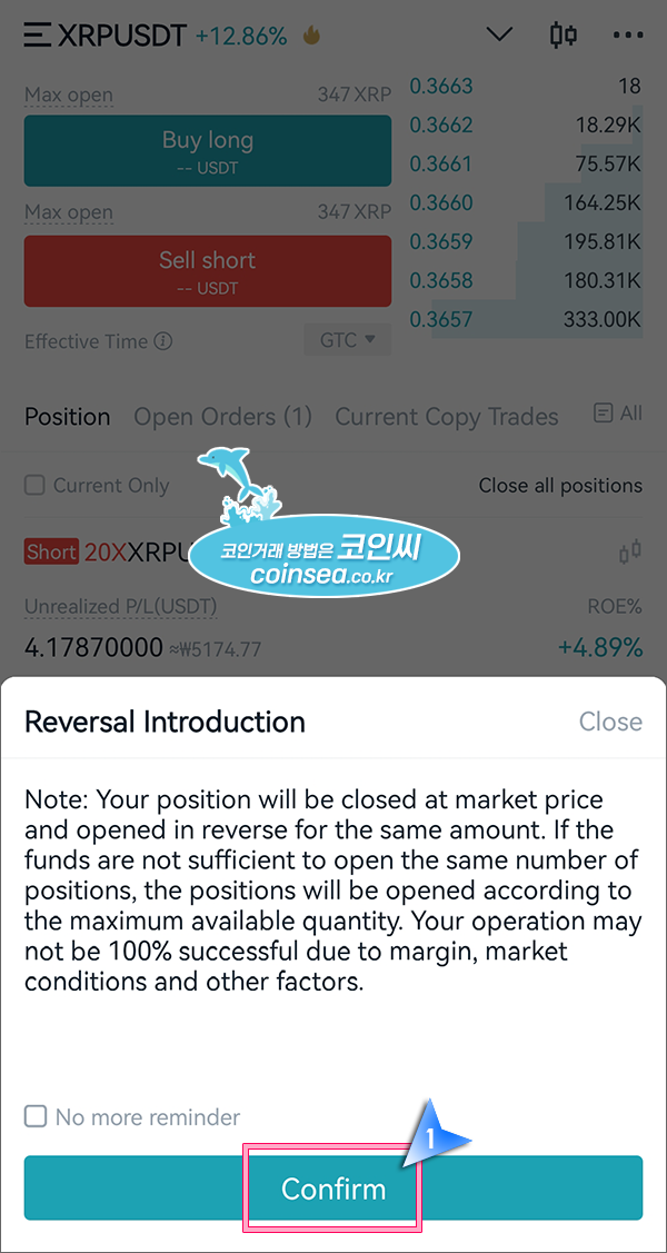 2. Reversal을 눌러서 나오는 메시지 하단의 Confirm을 누르면 곧바로 시장가로 포지션이 정리되고, 다시 시장가로 포지션이 생성됩니다. 경우에 따라서는 증거금 부족으로 체결이 안될수도 있습니다. 이럴 경우에는 수량을 다시 100%로 설정해놓고 잡으시면 됩니다.