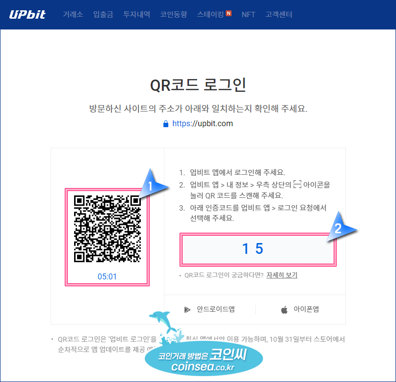2. 아래 이미지처럼 QR코드와 파란색 숫자가 뜨는데, QR코드를 휴대폰 업비트 앱에서 촬영한 후, 파란색 숫자를 선택해주시면 됩니다.