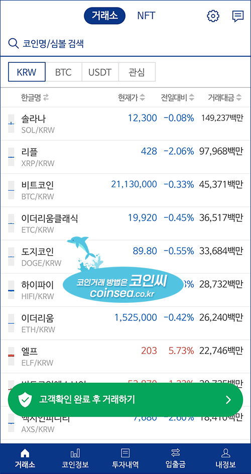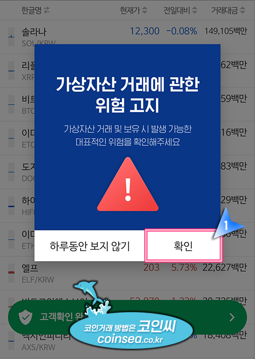 "이 포스팅은 거래소 이용 방법만 알려드릴 뿐, 투자를 강요하거나 종용하지 않습니다. 코인거래는 고위험 투자상품으로 원금 손실의 위험이 높습니다. 따라서 투자 판단의 책임은 투자자 본인에게 있으며, 그로 인해 발생 가능한 모든 손실의 책임도 투자자 본인에게 귀속됩니다."