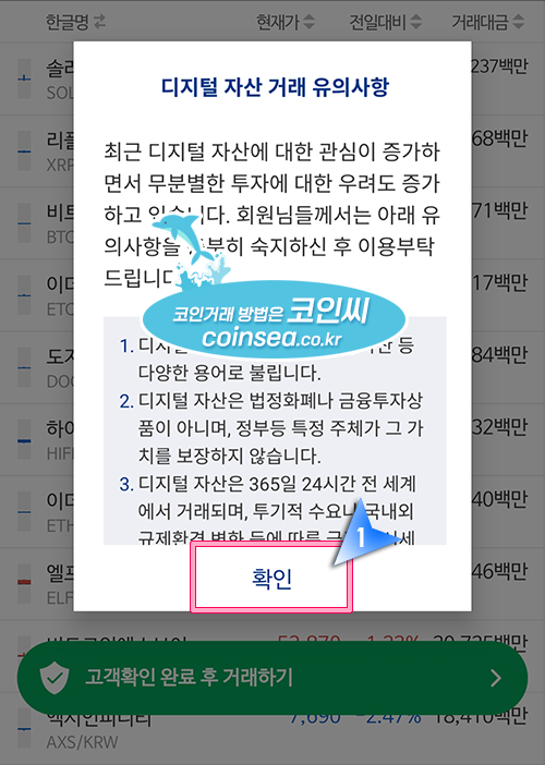 14. 가상자산 거래에 관한 위험 고지 팝업창이 뜨는데 코인 거래가 처음이시라면 해당 내용을 꼭 읽어보시기 바랍니다. "확인"을 클릭합니다.
