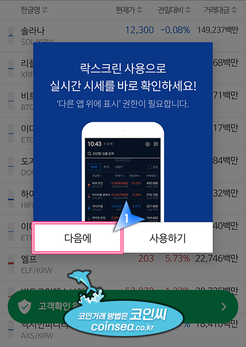 15. 락스크린은 휴대폰을 터치했을 때 화면에 업비트 시세창이 곧바로 보이도록 하는 서비스 기능입니다. 사용하시려면 '사용하기' 추후에 사용하시려면 "다음에"를 클릭합니다.