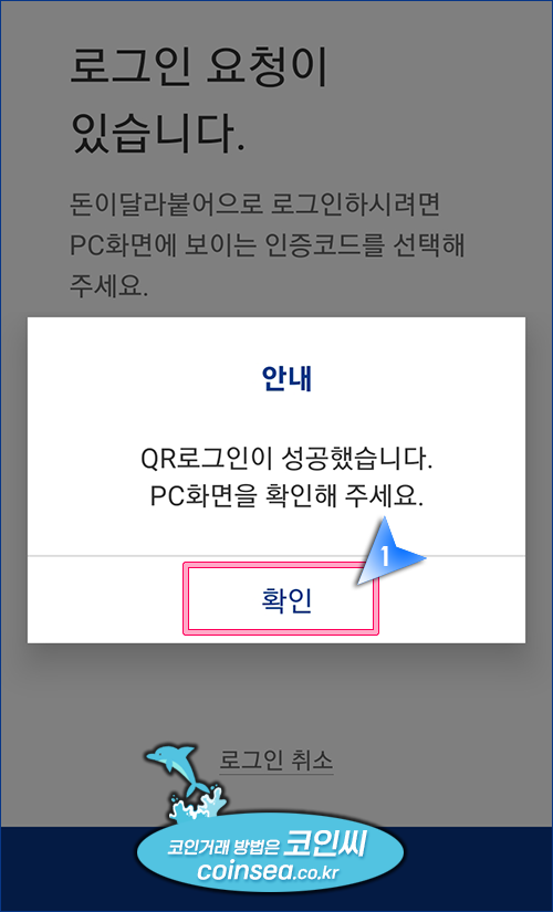 7. "확인" 버튼을 클릭하면 PC에서 업비트에 로그인 됩니다.