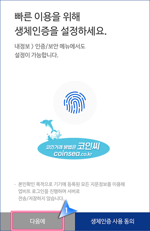 9. 지문 인식을 사용하시려면 "생체인증 사용 동의"에 체크를 해주시고, 추후에 사용하시려면 "다음에"를 클릭합니다.