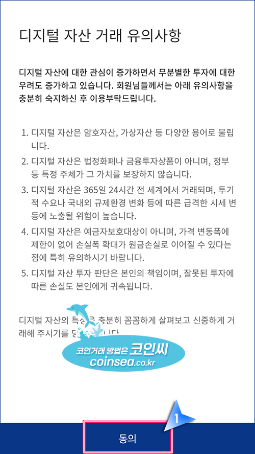 2. 디지털 자산 거래 유의사항을 읽고 하단의 "동의"를 클릭합니다.