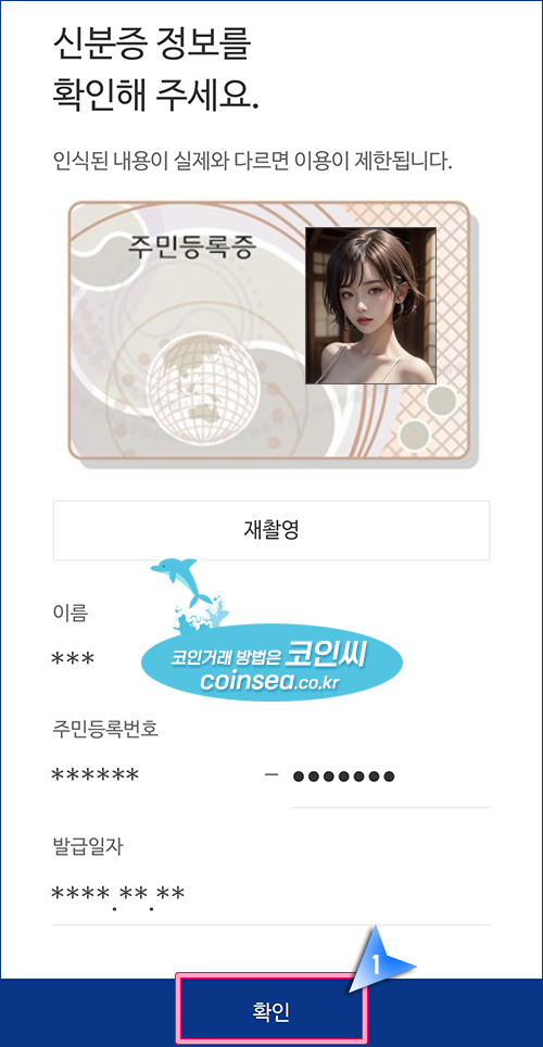 9. 본인의 주민등록증을 촬영한 후, 이름, 주민등록번호, 발행년월일이 맞는지 확인후, "확인" 버튼을 클릭합니다.