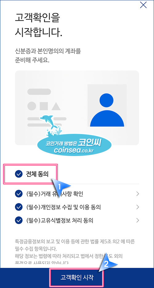 3. 거래 유의사항과 개인정보 수집 동의 등에 대한 '전체 동의'에 체크하시고, "고객확인 시작" 버튼을 클릭합니다.