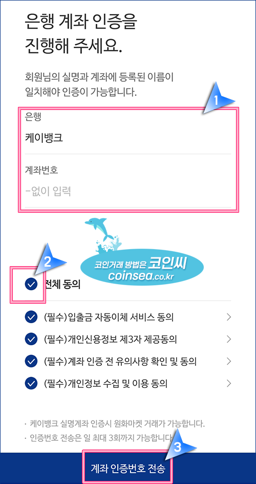6. 케이뱅크 계좌번호를 입력하고 '전체 동의'에 체크 후, "계좌 인증번호전송' 버튼을 클릭합니다.