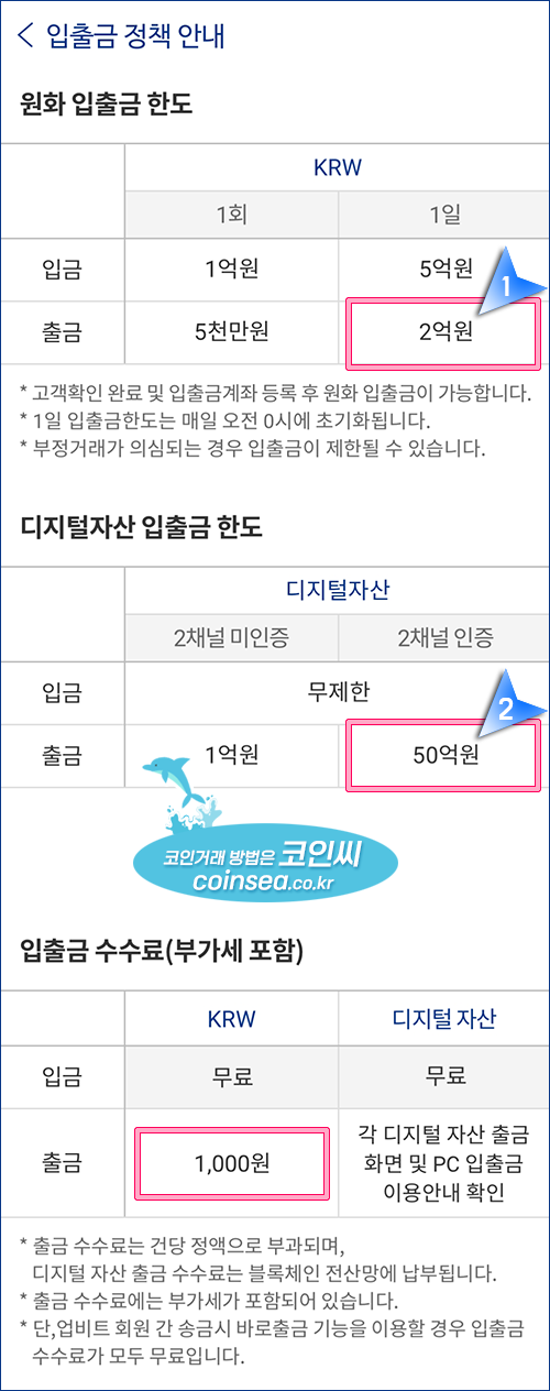 13. 2채널 인증까지 완료되었다면 1일 원화의 출금한도는 2억원이며, 디지털 자산, 즉 코인의 출금한도는 50억원입니다. 원화의 출금 수수료는 금액 상관없이 1회당 1천원의 수수료가 발생합니다. 1억원을 출금해도 1,000원, 2천원을 출금해도 1,000원입니다.