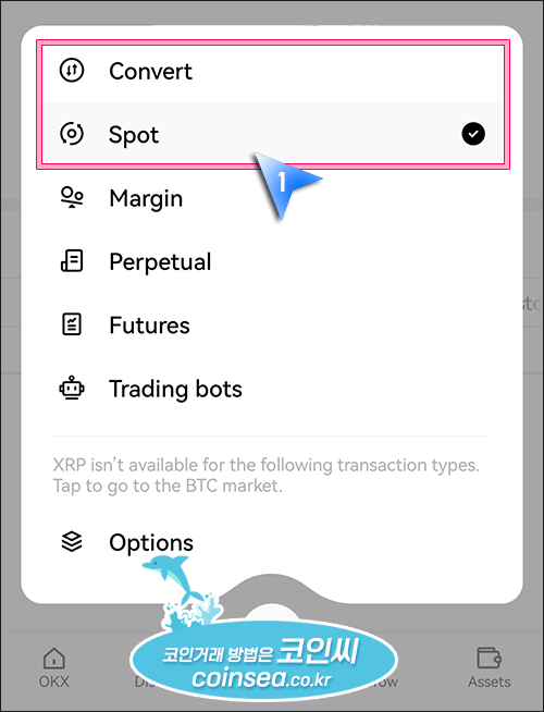 2. USDT를 리플로 교환을 할텐데 2가지 방식이 있습니다. Convert는 거래화면을 거치지 않고 곧바로 USDT를 XRP로 교환하는 것이고, Spot는 XRP/USDT에서 리플을 매수하는 방식입니다.