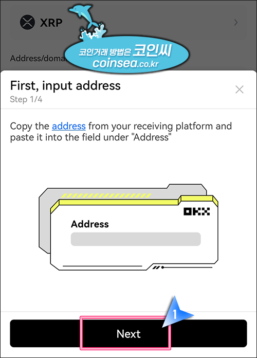 7. 초보자를 위한 가이드 화면으로 입금주소를 복사하여 출금주소에 붙여넣기 하라는 말입니다. "Next"를 클릭합니다.