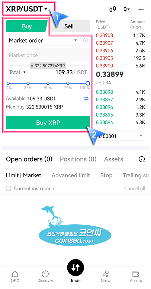 4. Spot를 클릭후 XRP/USDT 화면으로 이동해서 직접 리플 가격과 수량을 입력하여 리플을 구매하셔도 됩니다.