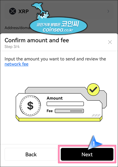 9. 출금수량을 입력하고 네트워크 수수료를 확인하라는 말로, 수수료는 자동차감됩니다. "Next"를 클릭합니다.