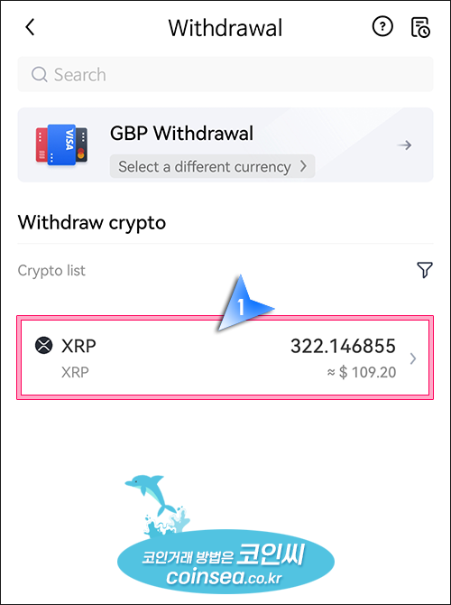 6. 출금(Withdrawal) 화면의 Search에서 XRP를 검색후, XRP를 선택합니다.