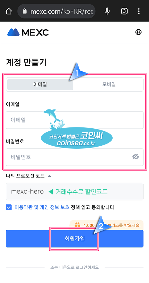 2. 이메일 주소와 비번을 입력하고 이용 약관에 동의 체크하시고 "회원 가입" 버튼을 클릭합니다. 만약 수수료 할인코드인 mexc-hero가 입력되지 않았다면 직접 입력해주셔야 수수료가 할인 적용됩니다.