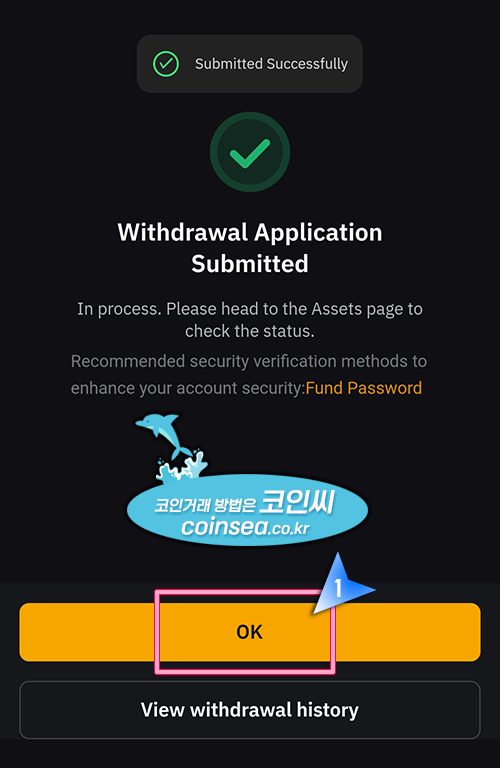 14. 바이비트에서 출금 신청이 완료되었습니다. OK 버튼을 클릭합니다.
