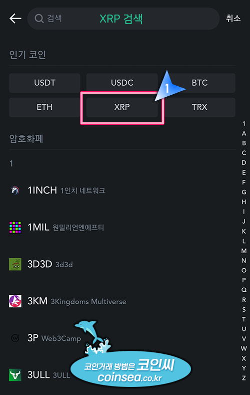3. 검색창에 XRP를 검색하거나 인기코인에 XRP가 보이면 선택해주세요.