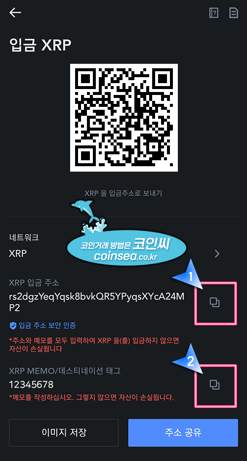 7. 주소와 태그를 각각 복사하여, 바이비트 리플 출금화면에 붙여넣기 해주시면 됩니다. 따라서 이 과정을 진행하려면 반드시 먼저 바이비트에 가입하고, KYC인증후 리플을 국내거래소에서 바이비트로 미리 보내 놓으셔야 합니다.