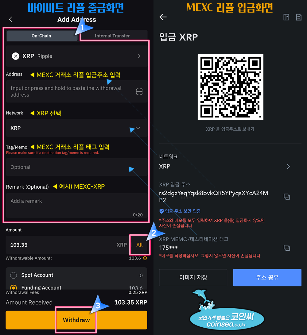 11. 바이비트 리플 출금화면과 MEXC 리플 입금화면을 나란히 비교해보았습니다. 네트워크는 XRP, Address에는 MEXC의 XRP 입금주소, Tag/Memo에는 MEXC의 MEMO/데스티네이션 태그를 복사하여 붙여넣기 합니다. Remark는 옵션 사항이라 입력하지 않아도 되지만 추후에 입출금을 계속해야 한다거나 출금 기록 확인시 필요하다면 MEXC-XRP와 같이 입력해두시기 바랍니다.