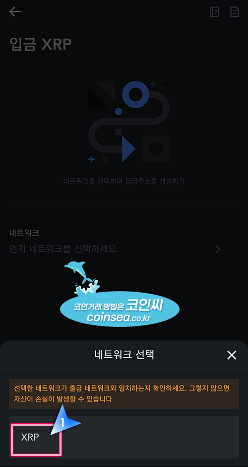 4. 네트워크 선택에서 XRP를 선택합니다. 참고로 코인은 입출금시 반드시 보내는 거래소와 받는 거래소의 입출금 네트워크가 동일해야 정상적으로 입금반영이 됩니다. 즉 바이비트에서 리플을 XRP 네트워크로 보내려면 MEXC에서도 입금주소를 XRP 네트워크를 선택후 발급받아야 합니다.