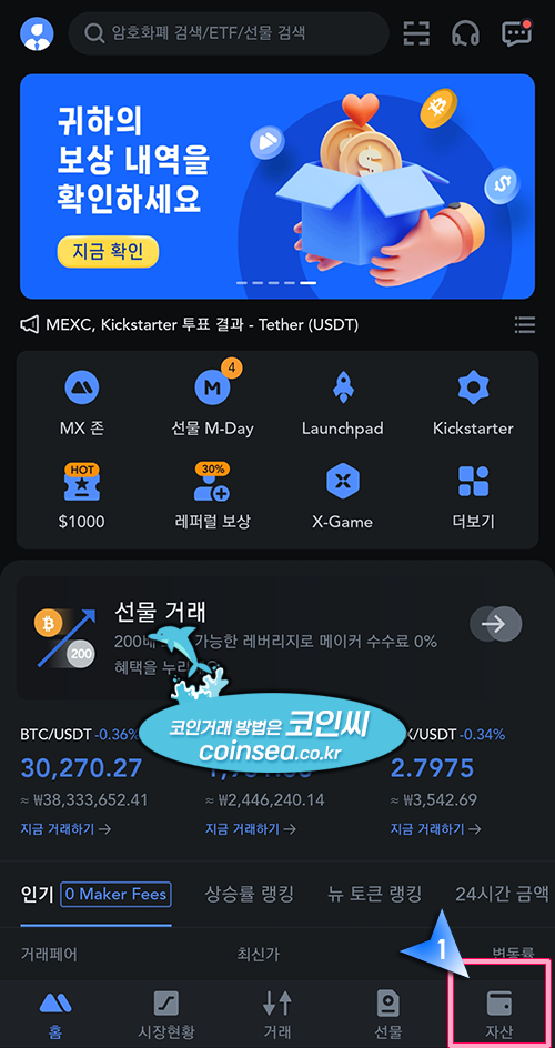 1. MEXC 거래소에 입금을 위해서 앱 하단의 "자산" 버튼을 클릭합니다.