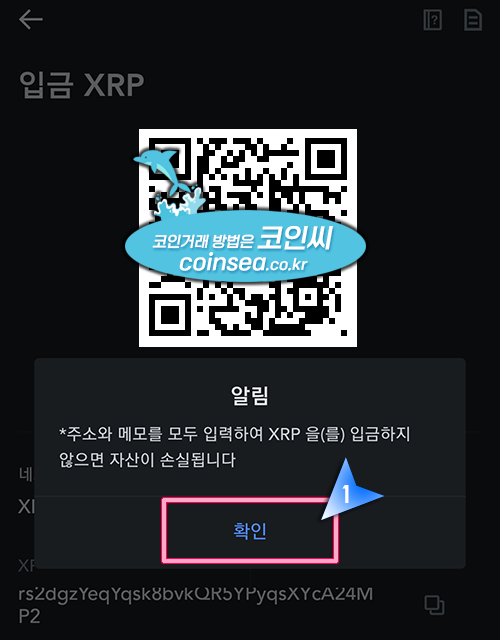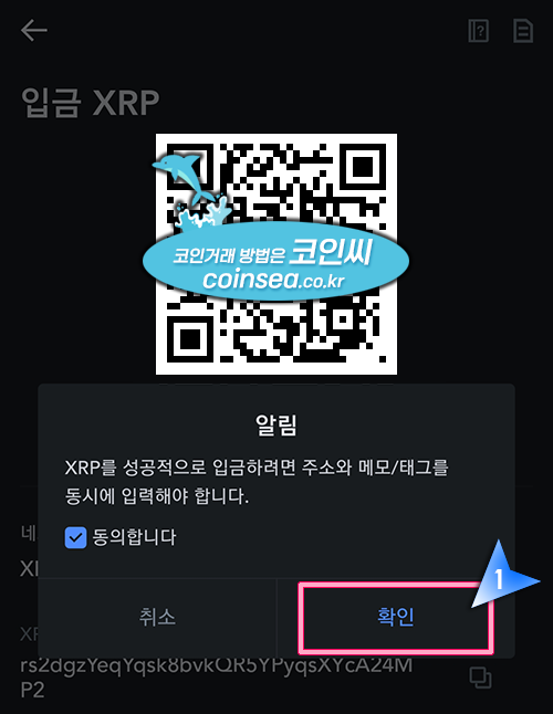 6. 리플을 입출금 하려면 반드시 입금 주소 외에 태그(데스티네이션 태그)도 함께 입력해야 한다는 내용으로 "동의합니다"에 체크후 "확인" 버튼을 클릭합니다. 입출금시 리플을 이용하는 이유는 수수료가 저렴하고 전송속도가 현존하는 코인중에서는 가장 빠르기 때문입니다.