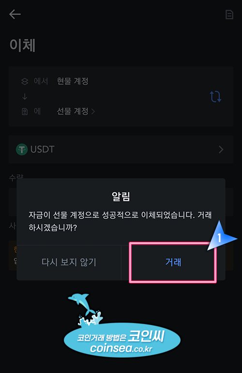 7. 선물계정으로 USDT가 성공적으로 이체되었다고 합니다. "거래" 버튼을 누르면 곧바로 선물거래 화면으로 이동됩니다.