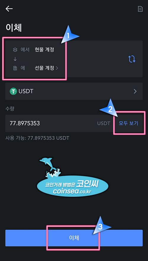 6. From에 현물계정, To에 선물계정으로 설정후, 수량을 직접 입력하거나 '모두 보기'를 클릭하시면 전체 USDT가 입력됩니다. 그리고 하단의 "이체" 버튼을 클릭합니다.