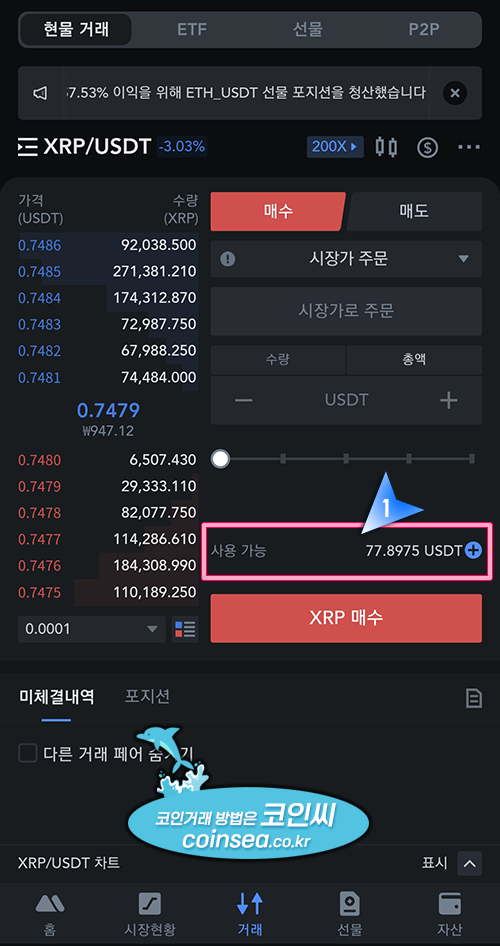 1. 앱 하단의 자산을 클릭한 후, 현물지갑에 리플이 입금된 것을 확인하였다면 리플을 USDT로 교환하기 위해서 앱 하단의 "거래" 버튼을 클릭합니다.
