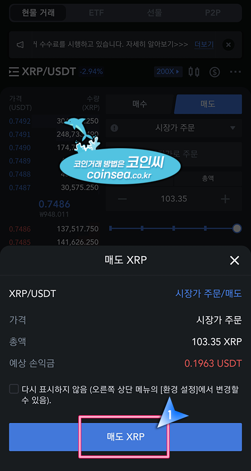 3. 내용을 확인후 "매도 XRP"를 클릭합니다.