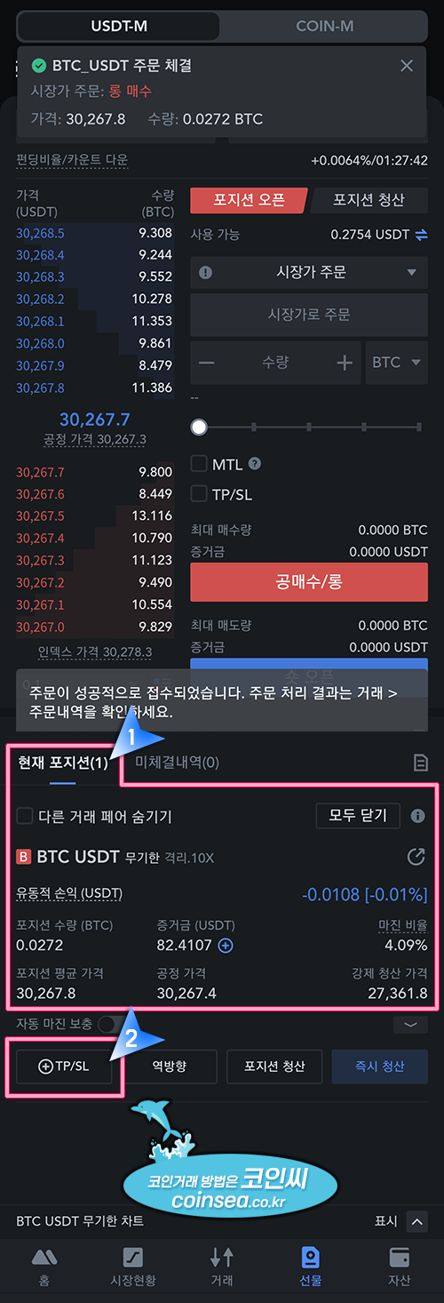 선물거래는 강제청산이 존재하기에 포지션을 잡았다면 무조건 손절가 설정을 하시기 바랍니다. 손절가 설정을 위해서 TP/SL을 클릭합니다.