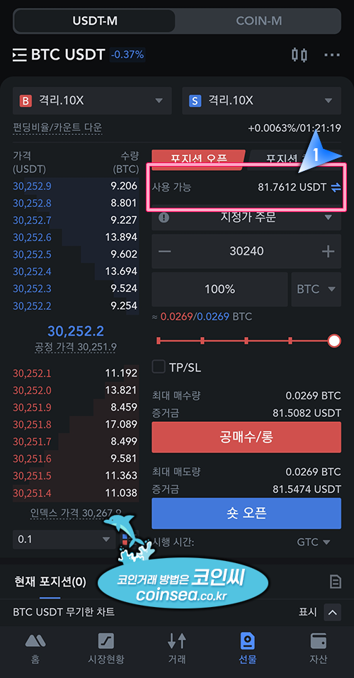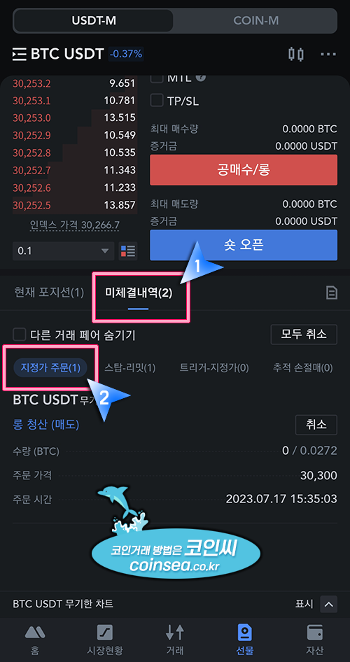 1. 앱 하단의 "선물" 버튼을 클릭후 USDT-M을 클릭합니다. BTCUSDT는 비트코인 선물거래입니다. 다른 코인의 선물거래를 하시려면 BTCUSDT를 클릭해서 코인을 선택할 수 있습니다.