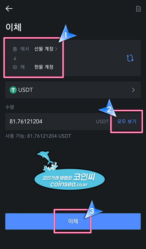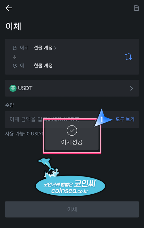 2. From에서 선물 계정, To에 현물 계정을 선택후, 이체할 수량을 직접 입력하거나 전부 다 이체하려면 '모두 보기'를 클릭합니다. 그리고 하단의 "이체" 버튼을 누르면 선물 계정에 있던 USDT가 현물 계정으로 이체됩니다.