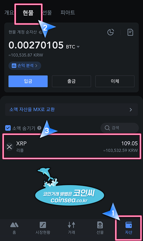 6. 리플이 매수되었습니다. 앱 하단의 자산을 클릭후, 현물지갑을 보시면 매수된 리플이 보입니다. 리플을 클릭해주세요.