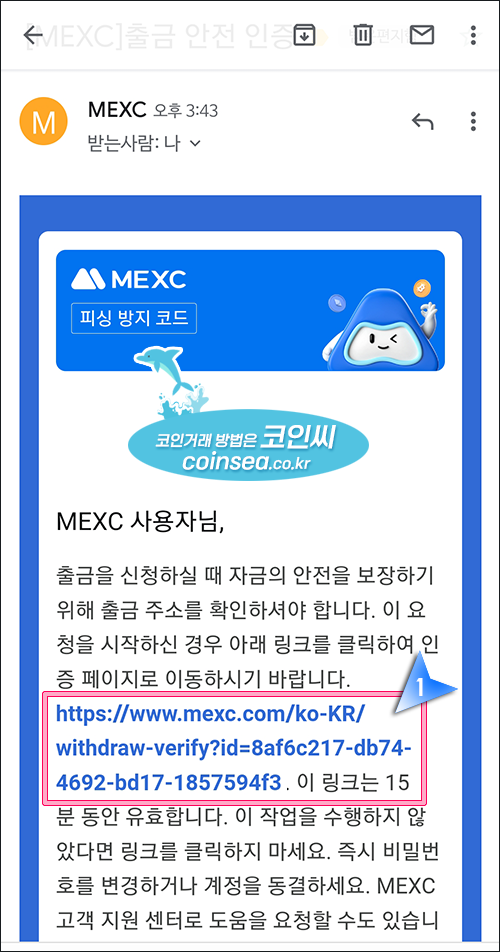 14. 메일로 도착한 MEXC 출금 인증 링크를 클릭해주세요. 만약 메일이 도착하지 않았다면 "인증코드 요청" 버튼을 누르지 않았거나, 스팸 메일함에 도착했을 가능성이 높으니 스팸 메일함도 확인해주시기 바랍니다.
